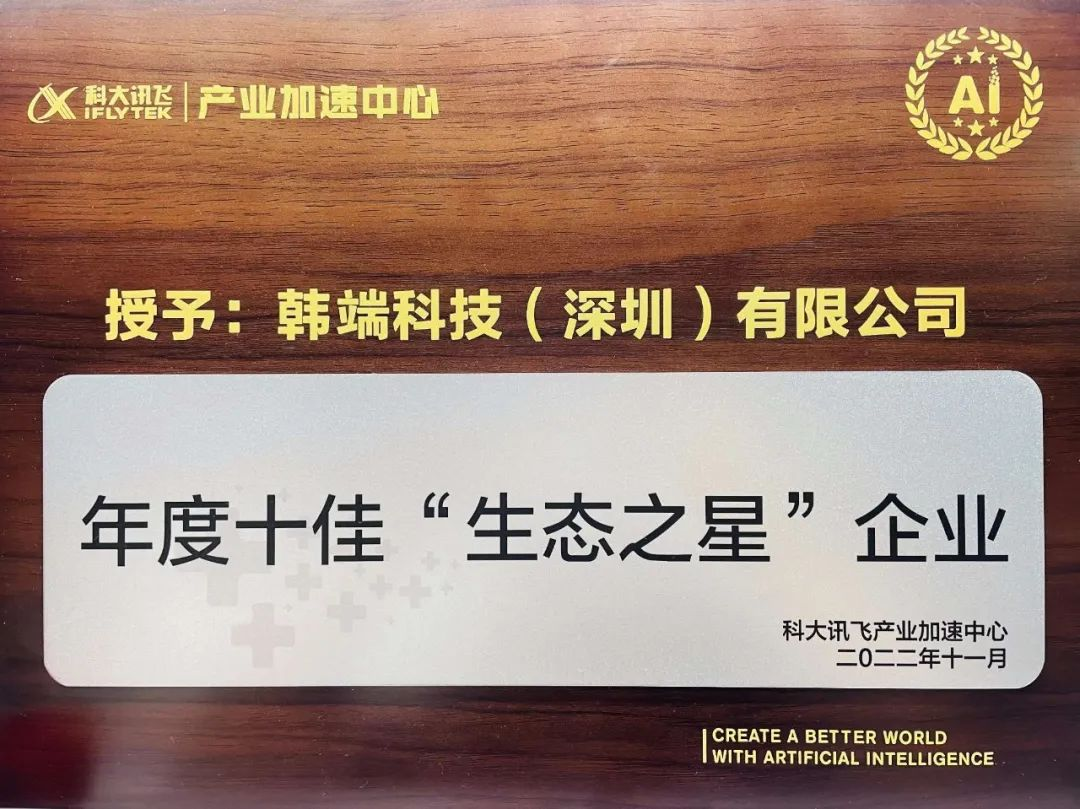 同期,大會舉辦了2022“科創中國”企業創新大家談第三期暨人工智能產業發展高峰論壇,本次高峰論壇是由中國科學技術協會主辦,中國科協企業創新服務中心和科大訊飛承辦。在論壇上韓端科技獲評本次活動最具含金量獎項-科大訊飛“年度十佳生態之星”企業。而且,在本次參與的世界聲博會暨科大訊飛全球1024開發者節展覽中韓端科技又被主辦單位評選為“最具商業價值獎”。