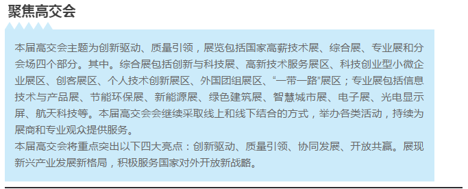 舉辦單位:高交會(huì)組委會(huì)【由商務(wù)部、科技部、工信部、國(guó)家發(fā)改委、農(nóng)業(yè)部、國(guó)家知識(shí)產(chǎn)權(quán)局、中國(guó)科學(xué)院、中國(guó)工程院等國(guó)家部委和深圳市人民政府共同舉辦】